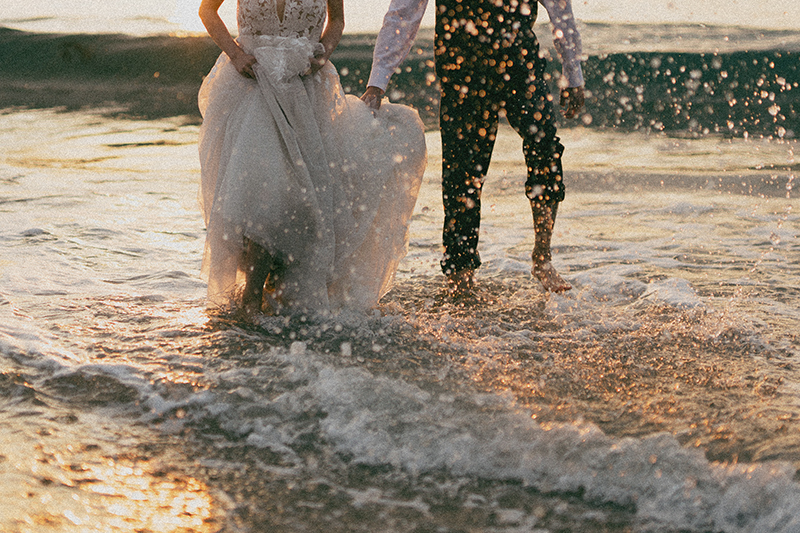 頬を撫でる潮風、白い砂浜、透き通るエメラルドグリーンの海。京都の豊かな自然とともに残す、フォトウェディング・結婚式前撮り。ウェディングドレスでの撮影に最適な春から秋まで、京丹後市夕日ヶ浦などの水平線に夕日が落ちるビーチでは、よく晴れた日の日没前後は幻想的な光景を目にすることができます。